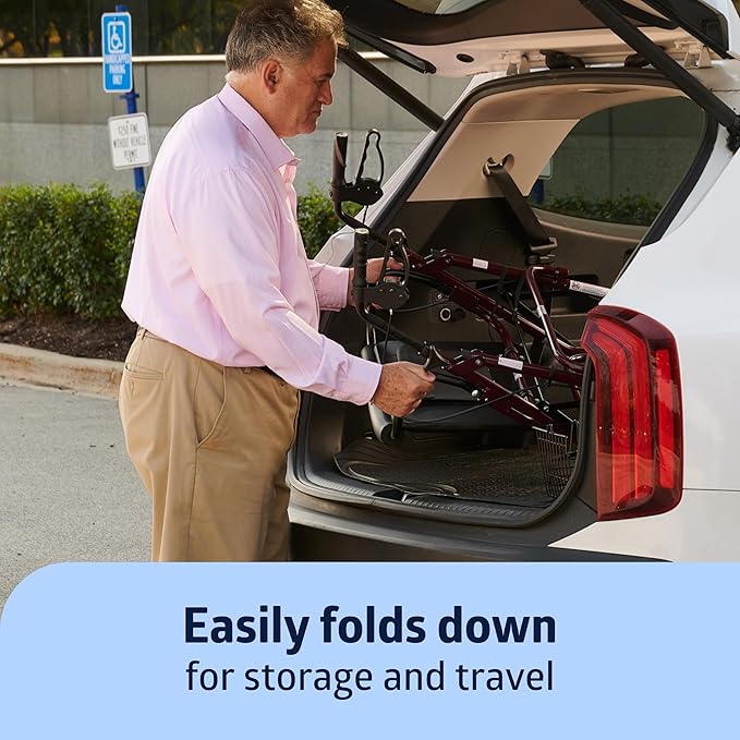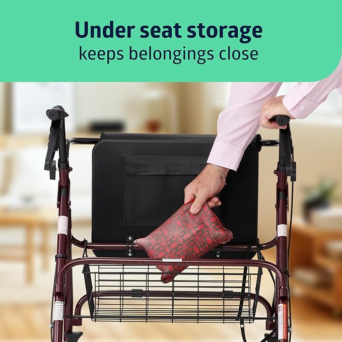 Medline Large Extra Wide Aluminum Bariatric Rollator Walker with Seat, Burgundy, 400 lb. Weight Capacity, Foldable, Under Seat Storage, 8" Wheels, Padded Backrest, Rolling Walker For Seniors & Adults