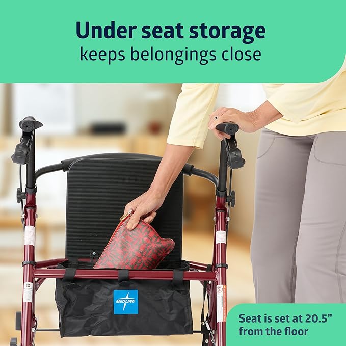 Medline Aluminum Rollator Walker with Seat, Burgundy, 250 lb. Weight Capacity, Lightweight, 6” Wheels, Foldable, Adjustable Handles, Rolling Walker for Seniors
