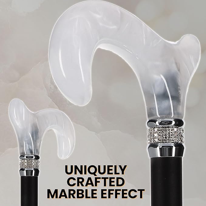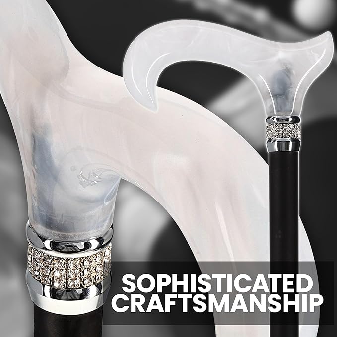 - Pearlescent Handle with Acrylic Swirl Pattern: The derby style handle boasts a beautiful white acrylic swirl pattern, providing both elegance and comfort with its smooth, sleek texture. This intricate pattern adds a touch of sophistication to your ensemble, making it perfect for any occasion.