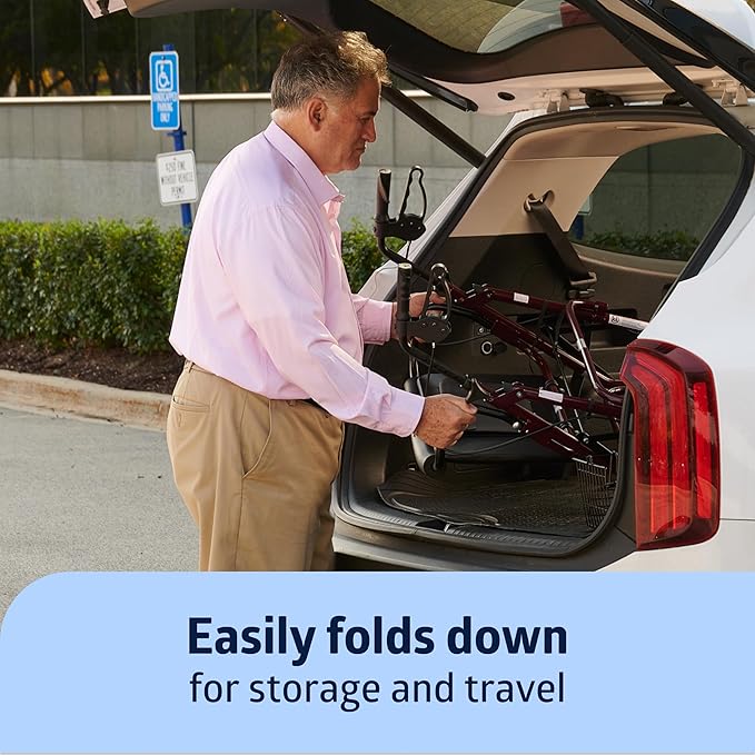 Medline Large Steel Bariatric Rollator Walker with Adjustable Handles, Padded Seat & Backrest, Burgundy, 500 lb. Weight Capacity, Foldable, Under Seat Storage, 8" Wheels, For Seniors & Adults