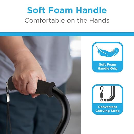 - Comfort foam hand grip with wrist strap for convenience: Soft, non-slip foam handle reduces hand fatigue and improves comfort during walks; built-in strap helps keep cane nearby when seated or standing - featuring a stand-alone base for added support