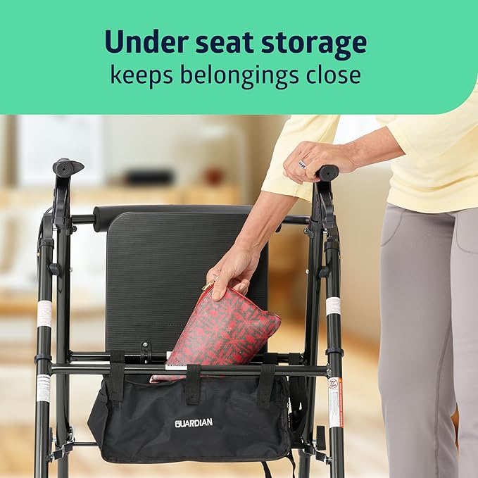 - Additional Amenities: Comes with a comfortable padded seat and backrest, a convenient storage bag under the seat, and 6-inch wheels/casters for smooth mobility