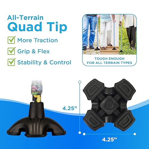 - Quad offset self-standing walking cane: Designed for optimal wrist alignment and walking support; lightweight frame adjusts from 28 to 39 inches to fit users 4'11" to 6'4" with an overall tip diameter of 4.75” x 4.75” and a 300 lb weight capacity