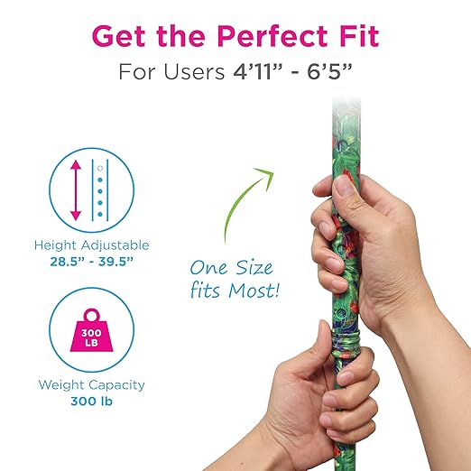 - Available in eye-catching florals, classic prints, and modern colors: Cane for women and men, adults, seniors, elderly and mobility-challenged; non-slip, all-terrain, stand-alone feature provides long-lasting use on tile, carpet, and outdoor surfaces