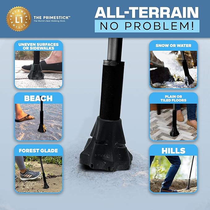 - SLIPPERY GROUND IS A FALL WAITING TO HAPPEN Ordinary canes can’t handle all terrains. The Prime Stick’s Cyclone Tip grips any surface, in any weather, keeping you steady on rough trails, wet floors, and uneven sidewalks. Don’t gamble with safety – choose Prime.