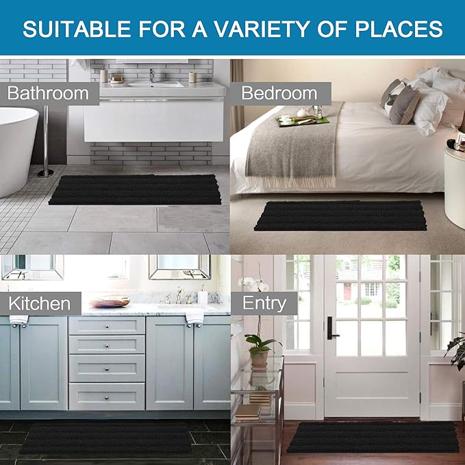 H.VERSAILTEX 2 Piece Bathroom Set - Super Absorbent Chenille Striped Bath Mats, Non Skid, Machine Washable - Jet Black, 47 x 17 Plus 17 x 24 Inches