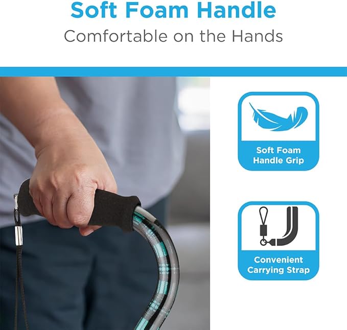 - Comfort foam hand grip with wrist strap for convenience: Soft, non-slip foam handle reduces hand fatigue and improves comfort during walks; built-in strap helps keep cane for women and men nearby when seated or standing