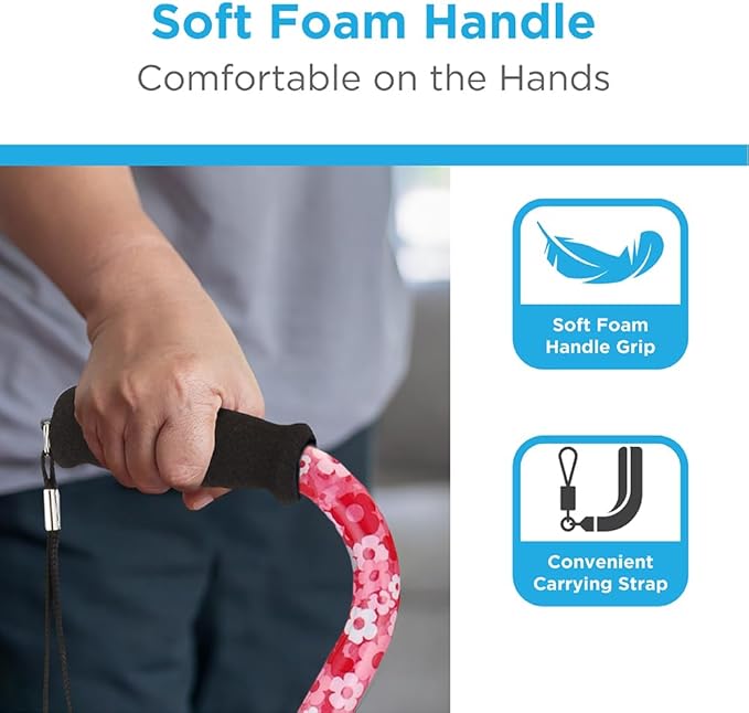 - Comfort foam hand grip with wrist strap for convenience: Soft, non-slip foam handle reduces hand fatigue and improves comfort during walks; built-in strap helps keep cane for women and men nearby when seated or standing