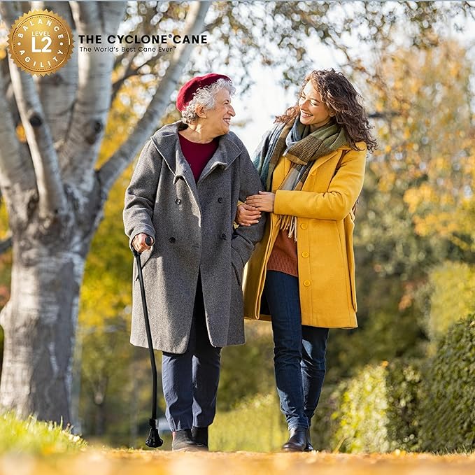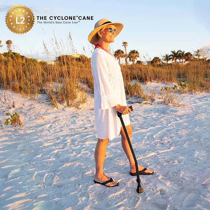 - CYCLONE CANE INNOVATIVE TIP DESIGN: Enhances stability and reduces the risk of slipping. Cyclone Cane Tip rocks back and forth, enabling the tip surface to remain in contact with the ground surface longer, to have a more secure grip. This extended surface contact provides a more confident footing on various surfaces, including tile floors, hardwood floors, sand, grass, gravel, and carpets. Adjustable and suitable for individuals who need a reliable walking aid for improved balance and stability.