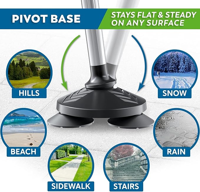 - Pivoting Tip: The base pivots to stay flat on almost any angled surface. Maximum ground contact on the non-scratch rubber base. The 3 pronged base is great for any type of terrain