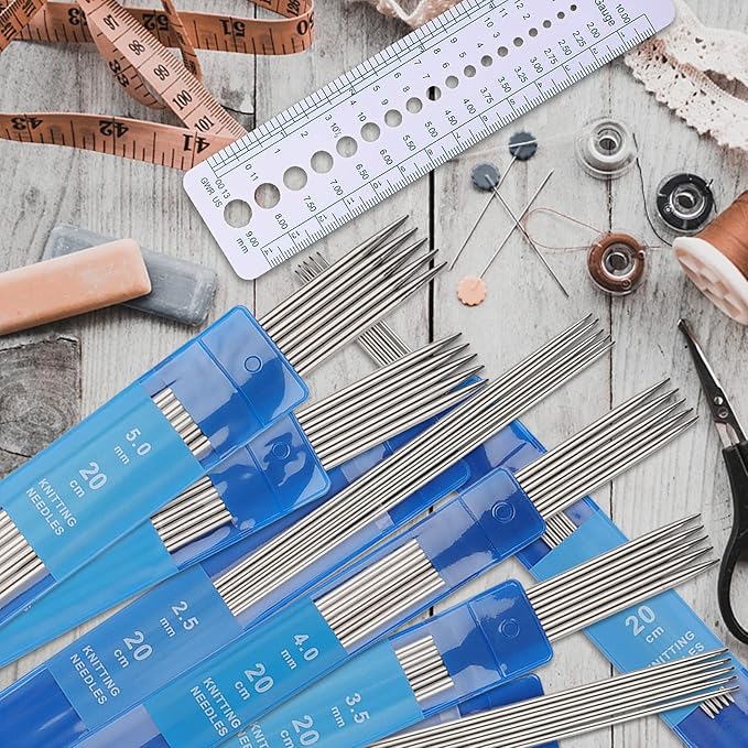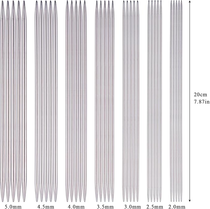 - [Available In Multiple Width Variations] The double pointed 20cm needle kit contains 7 sets of 5 different thickness sock needles. The sizes are 2.0mm/ 2.5mm/ 3.0mm/ 3.5mm/ 4.0mm/ 4.5mm/ 5.0mm. These knitting needles are available in a variety of different width variations, so that every knitter can ensure they have the perfect width for their purposes