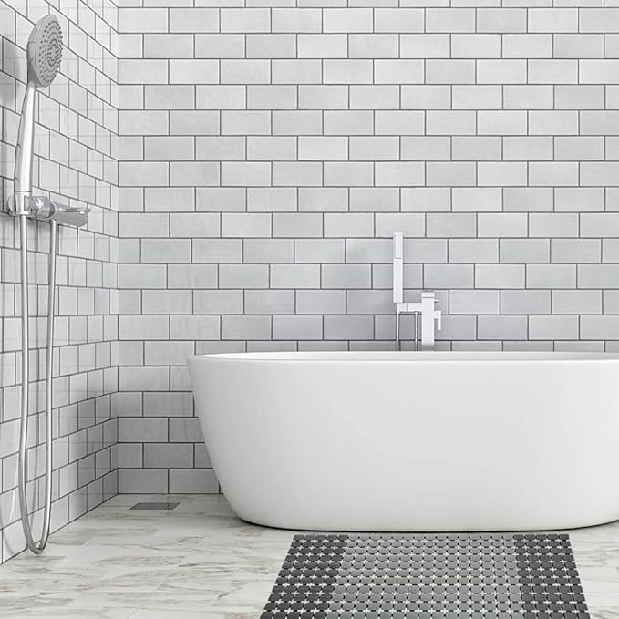 - ππππ πππ ππππππ: This design not only practical but also beautiful.The stylish neutral colors fits your home decor gorgeously,dark gray light gray color matching increase visual hierarchy and gives your bathroom design a cozy and modern look.The clever design with drain hole slotted panels allowing water and soapy water to quickly pass through the drain holes,instead of gathering around the feet,make the mat keep clean,roll it up and stand on the edge can quick dry.