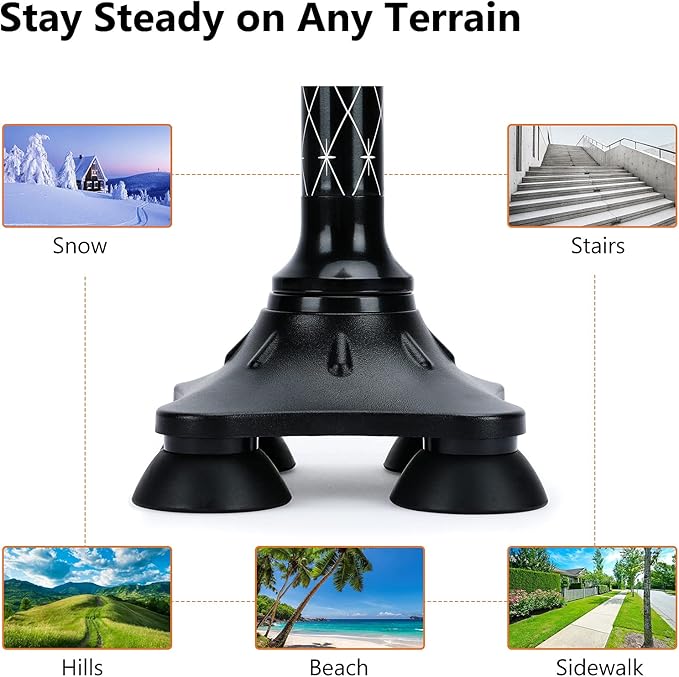 - 4-POINT ANTI-SLIP RUBBER BASE - Features a 4 prong cane base with an anti-slip backing that helps keeps maintain balance when walking up and down stairs, on grass, sand and even snow.