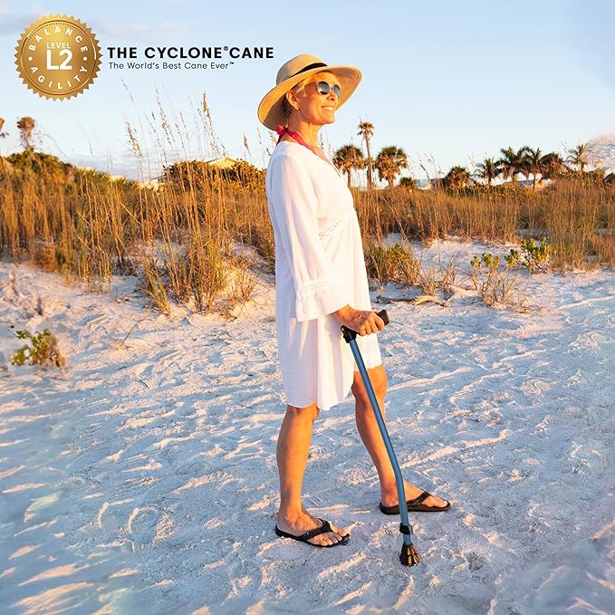 - CYCLONE CANE INNOVATIVE TIP DESIGN: Enhances stability and reduces the risk of slipping. Cyclone Cane Tip rocks back and forth, enabling the tip surface to remain in contact with the ground surface longer, to have a more secure grip. This extended surface contact provides a more confident footing on various surfaces, including tile floors, hardwood floors, sand, grass, gravel, and carpets. Adjustable and suitable for individuals who need a reliable walking aid for improved balance and stability.