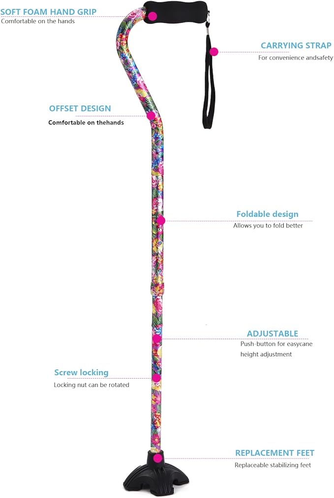 - 【Canes for Women & Seniors】Elegant Floral Design for Discreet, Confident Support This walking cane for women isn't just a mobility aid; it's a stylish accessory. The beautiful pattern offers elegant support, helping seniors and adults maintain confidence and independence with every step
