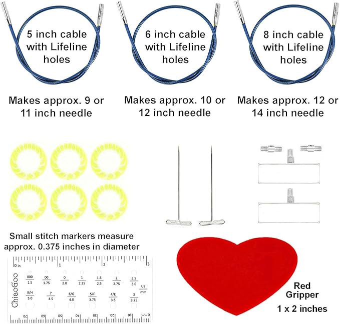 - Set also includes a total of 4 tightening keys, 2 needle gauges and 12 stitch markers and a stylish blue and red case and with zippered pockets