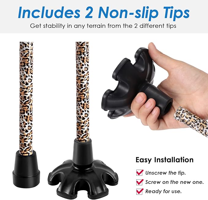 - REPLACEABLE FOOT COVERS | An extra-wide base helps keep the cane standing on its own.Another common foot pad is easy to carry. The anti-skid design provides a good strong grip, endowing the platforms with excellent antiskid property and wearability.