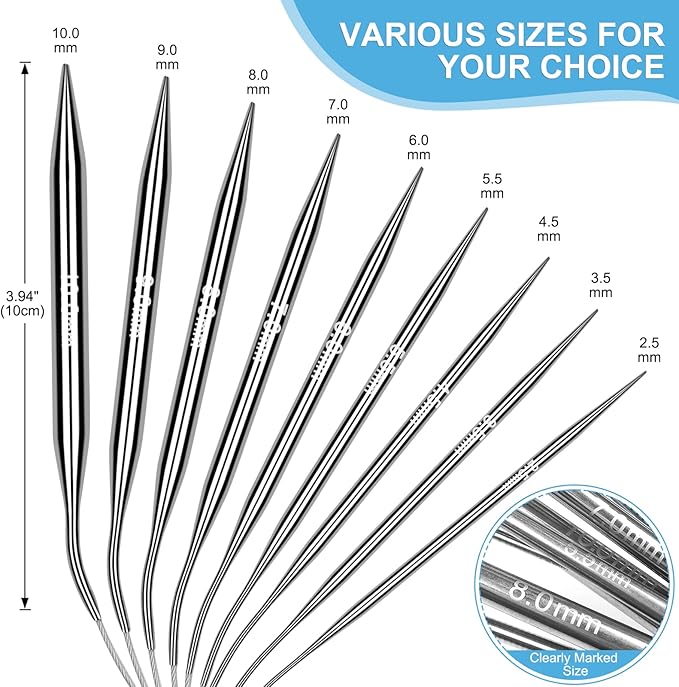 - [Great Quality - Stainless Steel Needles] The circular knitting needles are made of stainless steel hollow tube, which can easily slide on the yarn without tearing the yarn. The cable is strong and the transition from cable to needle is smooth. Double pointed round knitting needles with flexible wire rope are more convenient to store than straight needles.