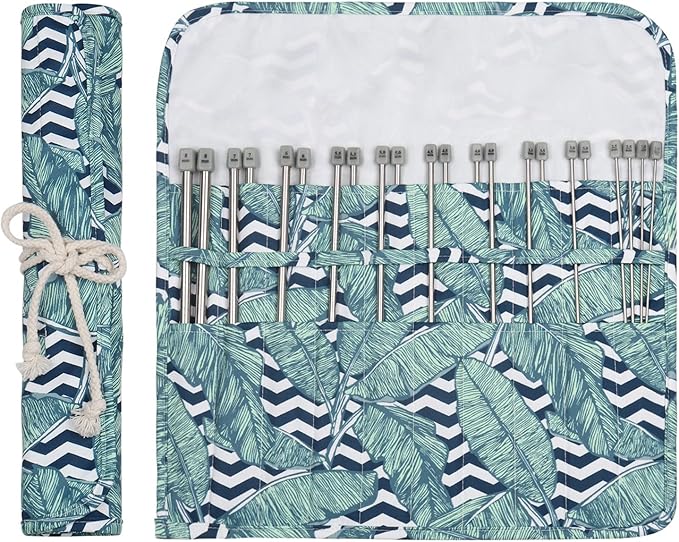 - [Knitting Needles Set with Case] This knitting needle storage bag is made of soft high quality fabric and is very durable. The pretty leafy printed roll bag has two twisted ropes that can be knotted at will to prevent metal knitting needles to drop. The knitting needles roll bag size is 38 x 38 cm with 20 slots, give plenty of space for your needles and keep everything neat and tidy.