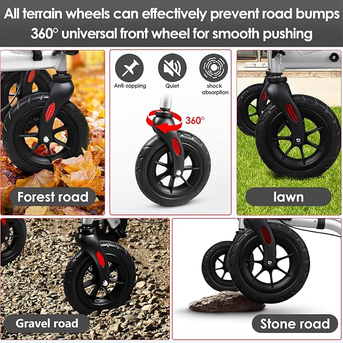 - 360 degrees anti slip swivel and Multi terrain Wheels: Henmnii Rollator walker features 8 inch all-terrain tires that has shock absorption function. 360 degrees anti slip swivel front wheel provide excellence mobility that makes movement easy .It can pass uneven roads better and reduce bumps caused by uneven road surface, perfect for gravel, navigating grass, dirt and gaps in sidewalks with ease.