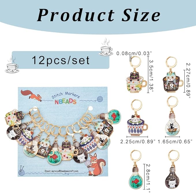NBEADS 12 Pcs Cup Cat Stitch Markers, 6 Colors Alloy Enamel Cat Crochet Stitch Marker Charms Removable Locking Stitch Marker for Knitting Weaving Sewing Accessories Quilting Handmade Jewelry
