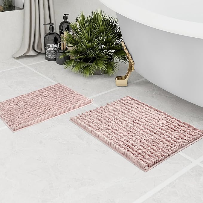 Walensee Bathroom Rug 2 Pieces Set Non Slip Bath Mat (17x24 Plus 20x32 Inch Dusty Pink) Water Absorbent Super Soft Shaggy Chenille Machine Washable Dry Extra Thick Perfect Carpet for Shower Floor