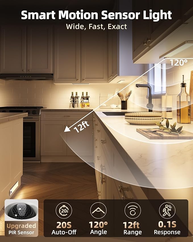 - Upgraded Motion Sensing with 3 Modes: In both modes, the light detects motion within 10 ft and a 120° field, automatically turning on and then switching off after 20 seconds of no movement. [Night Motion Mode]: activates only in low-light environment, perfect for late night use. No more stumbling in the dark trying to find the switch. [All-Day Motion Mode]: works any time motion is detected, ideal for areas that stay dim, where your main lights don’t reach. [Always On Mode]: provides continuous light for longer tasks like cooking, cleaning, or reading. Also handy for power outages or camping — reliable illumination whenever you need it.