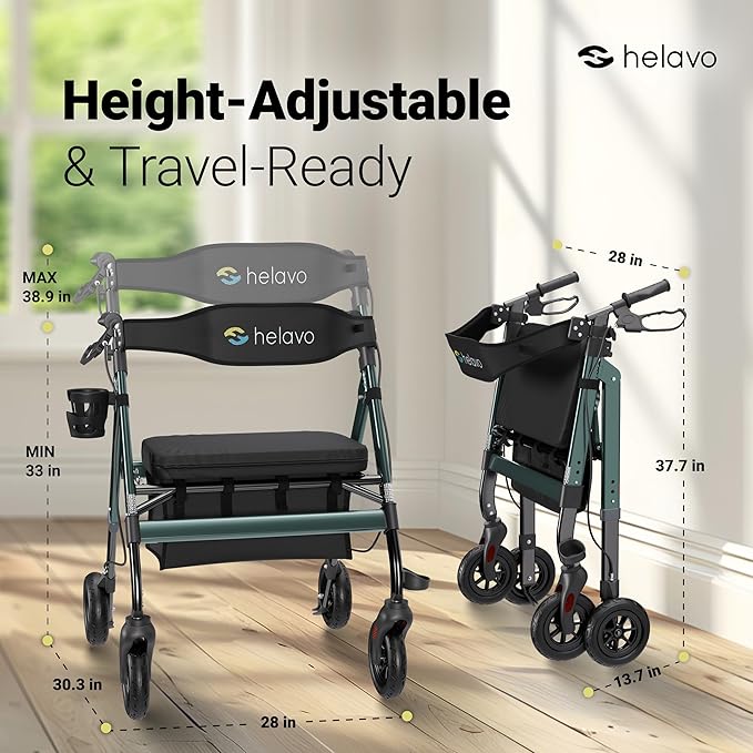 - Versatile and Easy to Transport: Featuring 8" wheels with reinforced spokes, the foldable walker ensures smooth maneuverability and stability across various surfaces. Its compact folded size of 37.8" x 28.3" x 13.8" and lightweight construction (21.4 lbs) make it easy to transport and store.