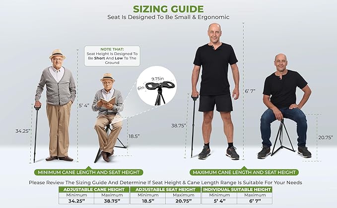 - ADJUSTABLE CANE CHAIR SEAT: Say goodbye to uncomfortable seating! Customize the height of this cane stool to your liking, and enjoy a throne fit for a king or queen, no matter where you roam. The crutch has a maximum length of 38.75” and a minimum length of 34.25”; Perfect for those within a height range of 5'4" - 6'7". When used as a seat the maximum seat height is 20.75” and the minimum seat height is 18.5”. Note that the seat is designed to be low to the ground.