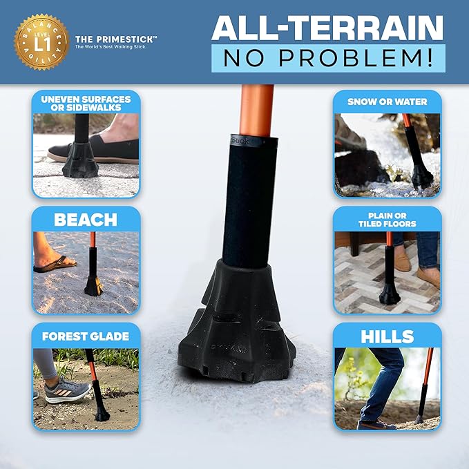 - SLIPPERY GROUND IS A FALL WAITING TO HAPPEN Ordinary canes can’t handle all terrains. The Prime Stick’s Cyclone Tip grips any surface, in any weather, keeping you steady on rough trails, wet floors, and uneven sidewalks. Don’t gamble with safety – choose Prime.
