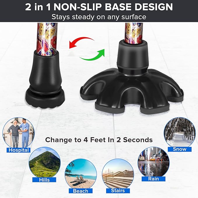 - 【Self-Standing Cane】Stable Base & Non-Slip Tip for Maximum Safety and Balance The innovative self-standing cane base keeps it upright and within reach. Paired with a sturdy non-slip rubber tip, it provides reliable stability and balance on tile, wood, or pavement
