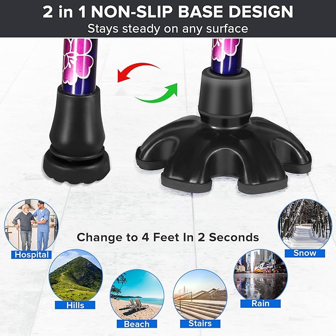 - 【Self-Standing Cane】Stable Base & Non-Slip Tip for Maximum Safety and Balance The innovative self-standing cane base keeps it upright and within reach. Paired with a sturdy non-slip rubber tip, it provides reliable stability and balance on tile, wood, or pavement