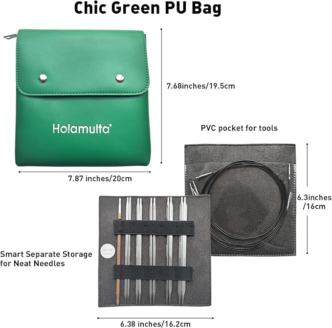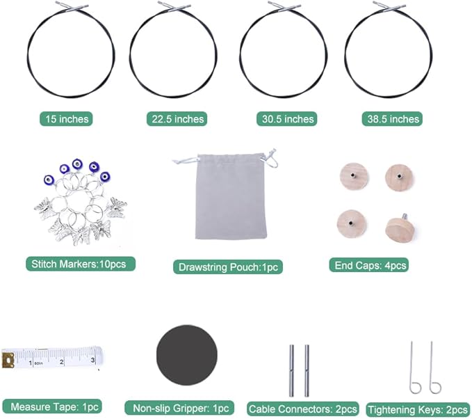- Stylish Storage & Charming Accessories: Keep your tools organized in a stunning green PU leather bag. Add a touch of elegance to your projects with 10 dainty stitch markers (5 butterfly, 5 evil eye). This set includes: 1 anti-slip gripper, and 1 measuring tape, 2 tightening keys, 2 cable connectors, 4 interchangeable knitting cables (15", 22.5", 30.5", 38.5"), 4 wooden end caps.
