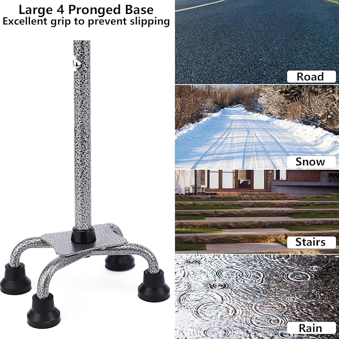 - 【Enhanced Stability & Safety】Features a wide 4-pronged base with non-slip rubber tips, providing superior stability and traction on various surfaces. This self-standing cane prevents slips and falls, offering reliable support for seniors and those recovering from surgery or injury, especially when bending is difficult