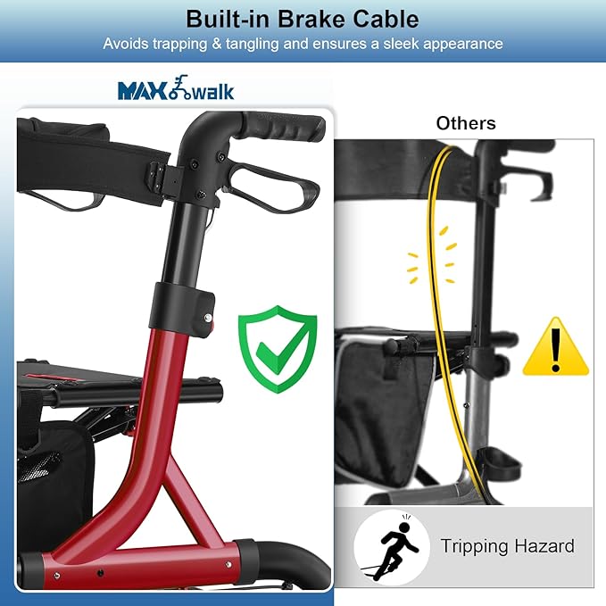 - 【Upgraded Safety-Built-in Cable Design】MAXWALK rolling walker adopts a built-in brake cable to avoid the risk of tangling and tripping while ensuring a compact appearance. The dual braking system supports speed control and lock, provides better control for braking and sitting.
