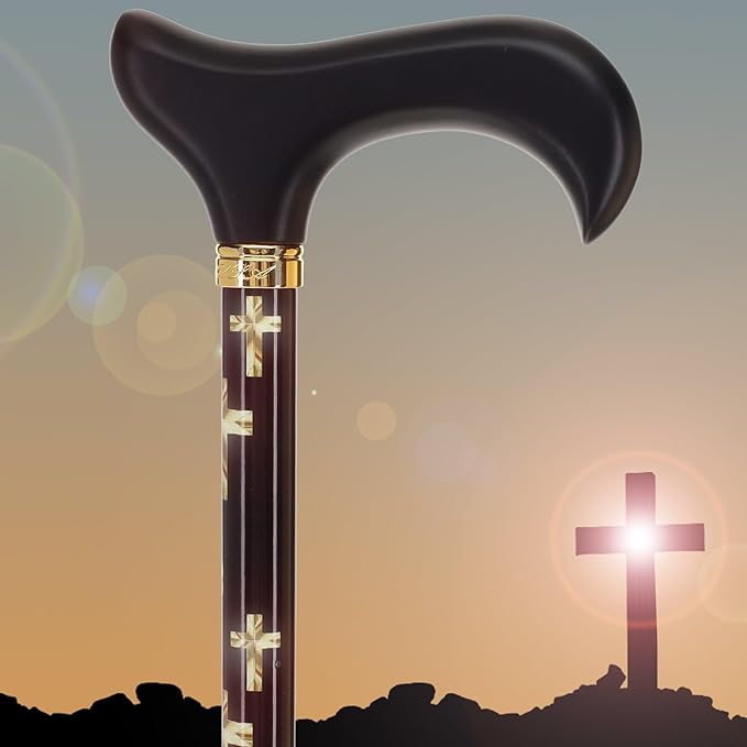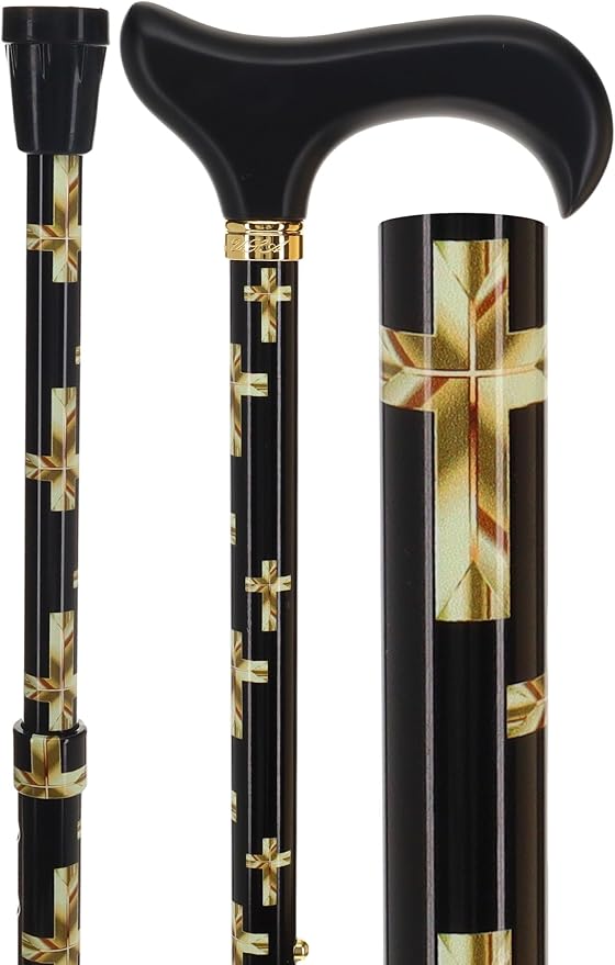 - Luxurious Design: Embellished with intricate golden crosses on a sleek black background, our Golden Cross Standard Adjustable Walking Cane exudes sophistication and style. Its elegant design adds a touch of luxury to any wardrobe, making it a statement piece wherever you go.