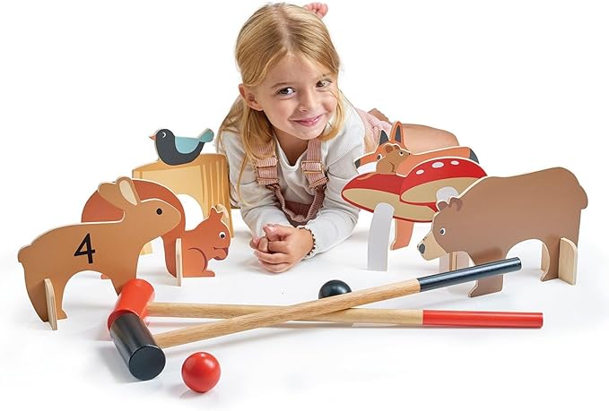 - TAKE A SWING - Charming forest creatures including a squirrel, rabbit, bear, fox, a tree trunk with bird and a toadstool with a mouse, can all be arranged to resemble a forest glade, sparking imaginative play. Perfect for 2 players, our interactive toy will help boost social skills and communication and is superb for encouraging physical development and the progression of hand-eye coordination. Croquet is a great game for improving concentration, patience, and precision.