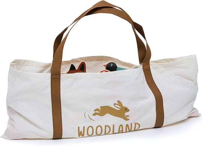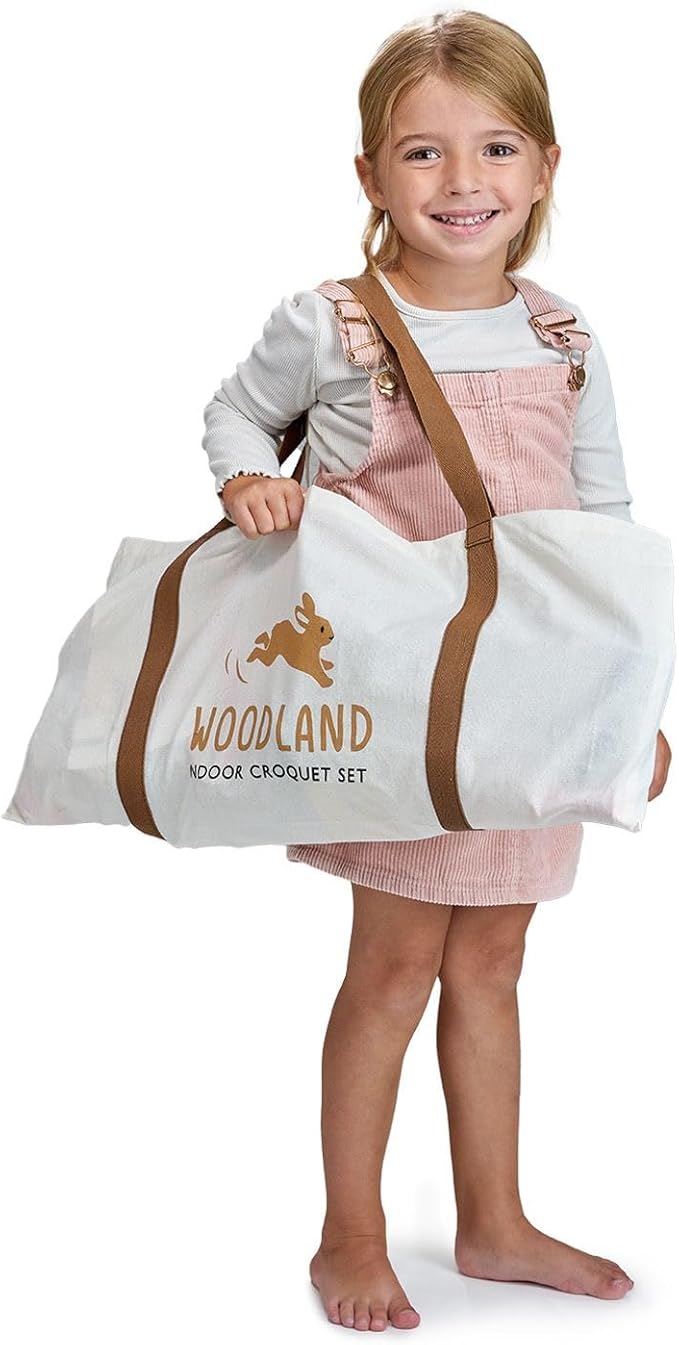 - FAMILY FUN - Our parent-child interactive game comes in a printed canvas bag with shoulder strap for portability and easy tidy up. The set includes 6 beautifully illustrated woodland themed croquet hoops, 2 wooden croquet mallets, and 2 wooden painted balls. Product size 21.46 x 1.77 x 4.06 in.