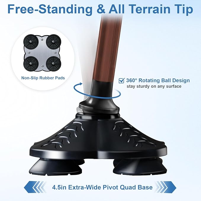 - 【Maximum Stability & Flexibility & Safety】This walking cane boasts a 360° rotating flex design and extra-wide base ensuring stable support and agile movement across all terrains; while multi-layered, anti-slip rubber tips enhance grip and safety, minimize fall risks, and protect floors from scuffs and scratches, empowering confident strides.