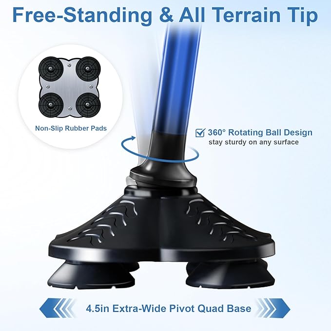 - 【Maximum Stability & Flexibility & Safety】This walking cane boasts a 360° rotating flex design and extra-wide base ensuring stable support and agile movement across all terrains; while multi-layered, anti-slip rubber tips enhance grip and safety, minimize fall risks, and protect floors from scuffs and scratches, empowering confident strides.