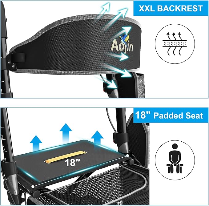 - 【Sturdy Frame & Senior-Friendly Features】Designed with a durable aluminum frame and non-slip handles, Aojin’s senior walker reduces wrist strain by 65% and provides reliable support. Its robust construction and user-friendly features make it a top choice for adult walkers with seats, ensuring safety and comfort.