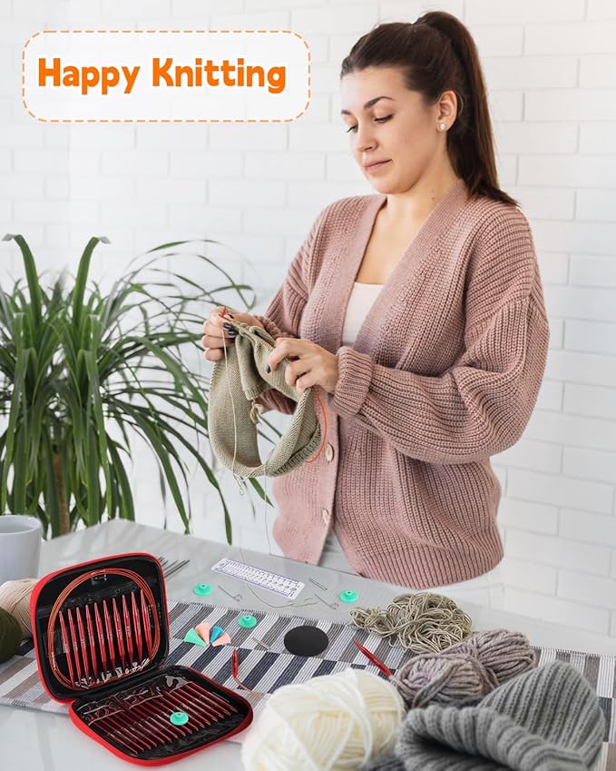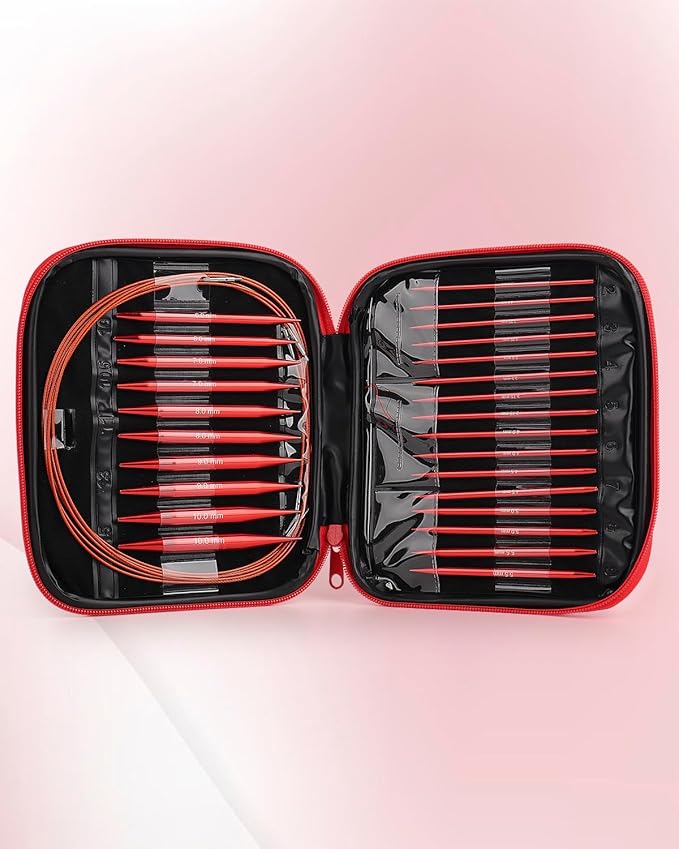 - [Red knitting needle set] Smooth round needles are size-marked for you to quickly distinguish them. Aluminium knitting needles won't lose paint and rust, and the cords can withstand the weight of the yarn, not easy to break. Whether you knit small or large yarns, this set of interchangeable needles in a variety of sizes will meet all your knitting needs!