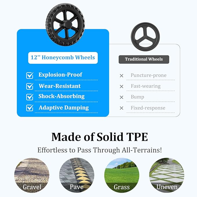 - 【12" Honeycomb Wheel Solid Tires】12-inch puncture-resistant honeycomb tires with shock damping can improve the efficiency of transport wheelchair propulsion and provide smooth rides on uneven terrain like gravel roads or speed bumps, ensuring comfort and stability for users. Durable solid material can be explosion-proof imitation, longer service life