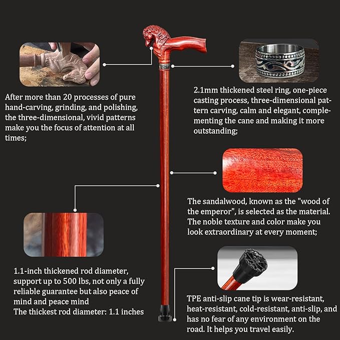 - HANDMADE COMFORTABLE WALKING CANE: This stylish wooden walking cane for men and women has gone through more than 20 processes from design, carving, grinding, etc., and hand-carved a lifelike three-dimensional horse head pattern, giving the cane a unique artistic charm.At the extension of the horse head, we combine the golden ratio of the palm, simulate the hand-grip form, and hand-craft a handle that fits the hand perfectly, so that you will not feel tired even if you use it all day