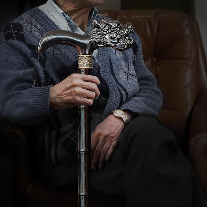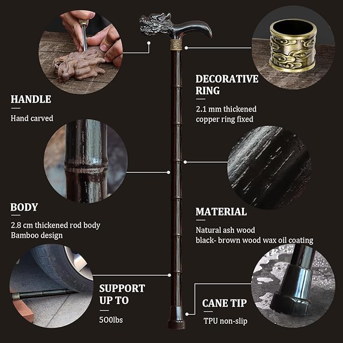 - NATURAL SOLID WOOD: The wooden walking cane is made of rare and precious ashwood, which is known as the "goddess of the wood". with exquisite carving dragon head pattern. It is not only Fashionable and eye-catching but also sturdy and durable. It is a solid wood walking cane tailored for users, making you confident and calm in every step