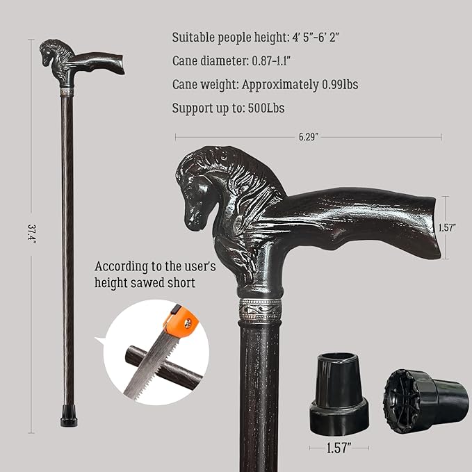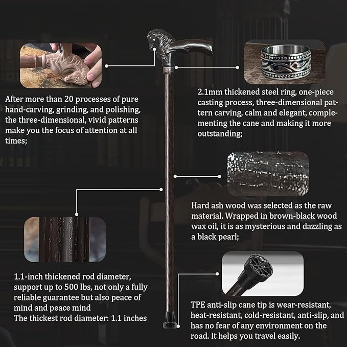 - HANDMADE COMFORTABLE WALKING CANE: This stylish wooden walking cane for men and women has gone through more than 20 processes from design, carving, grinding, etc., and hand-carved a lifelike three-dimensional horse head pattern, giving the cane a unique artistic charm.At the extension of the horse head, we combine the golden ratio of the palm, simulate the hand-grip form, and hand-craft a handle that fits the hand perfectly, so that you will not feel tired even if you use it all day