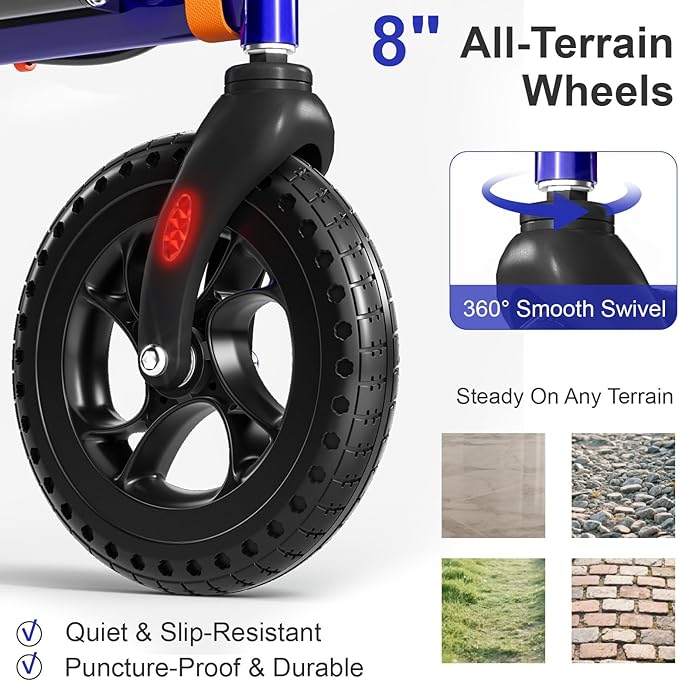 - 【All-Terrain 8" Wheels for Superior Stability】 Glide smoothly over diverse surfaces like gravel and grass with 8" puncture-proof rubber wheels. The 360° swivel front wheels ensure effortless maneuvering indoors and outdoors, providing reliable support and a stable adult walk for seniors on any terrain.