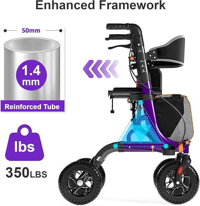 - 【All-Terrain 8" Wheels for Superior Stability】 Glide smoothly over diverse surfaces like gravel and grass with 8" puncture-proof rubber wheels. The 360° swivel front wheels ensure effortless maneuvering indoors and outdoors, providing reliable support and a stable adult walk for seniors on any terrain.