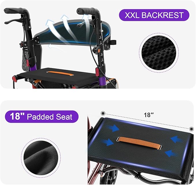 Rollator Walker for Seniors with Seat, Lightweight & Foldable, 8" All-Terrain Wheels, 18" Big Seat, 6-Level Adjustable Height Rolling Walker, 350 lb Capacity, Purple