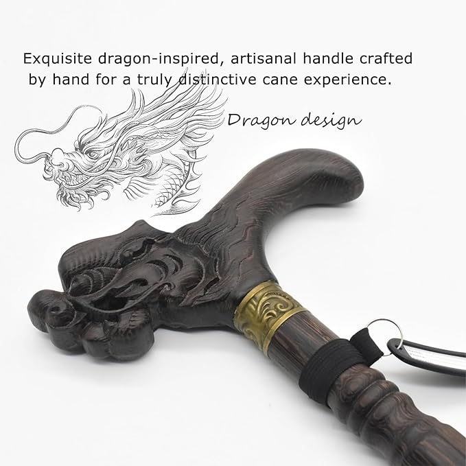 - 【Intuitive Dragon-Engraved Grip】The stunning design of our cool wooden engraved walking cane is not just a handle, but a work of art, featuring an exquisite dragon head grip with remarkable attention to detail. The ergonomic form not only provides a secure hold but also enhances the overall aesthetics, making it a sophisticated companion for daily use or special occasions.
